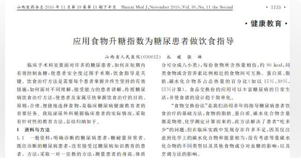 [1]丛媛.应用食物升糖指数为糖尿患者做饮食指导, 山西医药杂志(下半月刊) ,2010-11-25