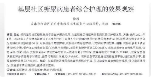 徐园.基层社区糖尿病患者综合护理的效果观察[J].中国城乡企业卫生,2025,40(04):228-230.