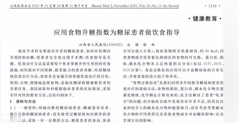 [1]丛媛.应用食物升糖指数为糖尿患者做饮食指导, 山西医药杂志(下半月刊) ,2010-11-25