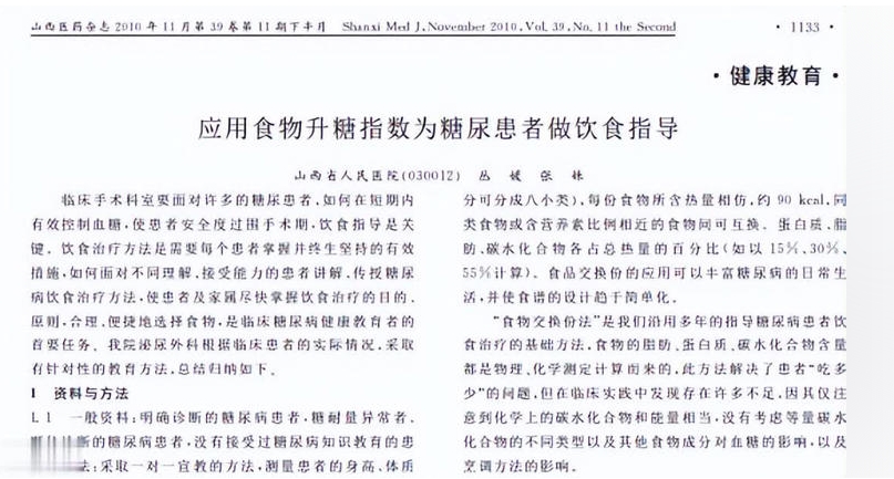 [1]丛媛.应用食物升糖指数为糖尿患者做饮食指导, 山西医药杂志(下半月刊) ,2010-11-25